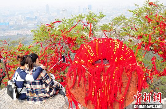 当日,许多游客登顶济南千佛山,在一把硕大的“同心锁”上系红丝带锁同心,整个山顶被红丝带“染红”。